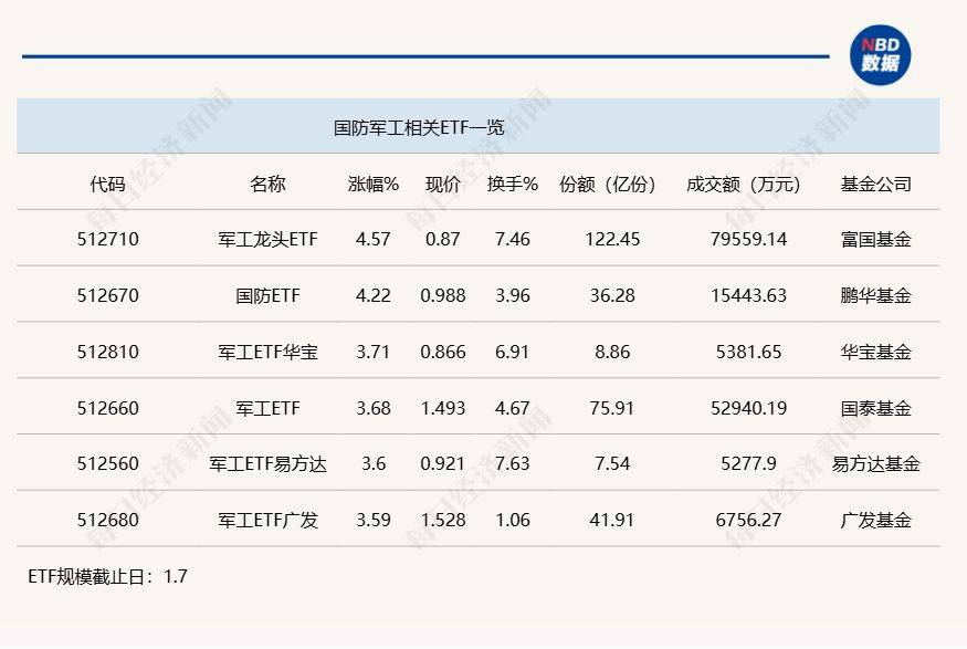 点评:军工龙头ETF(512710)今日上午涨幅为4.57%,该ETF份额为122.45亿份,半日成交金额为7.96亿元,其追踪的是中证军工龙头指数。