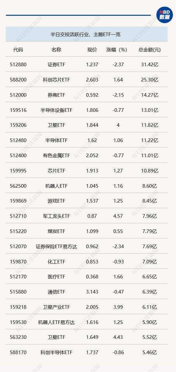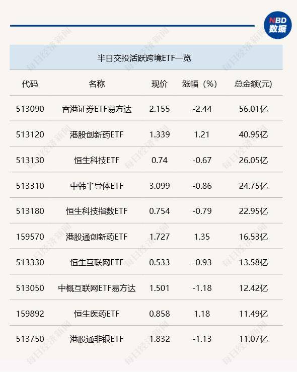 1月8日上午,ETF市场交投持续保持高活跃度,证券ETF(512880)再度放量,半日成交金额达到31.42亿元,而科创芯片、券商、半导体设备等相关ETF半日成交金额也在10亿元以上;跨境ETF方面, 香港证券ETF易方达(513090)半日成交金额依旧在50亿元以上,达到56.01亿元。