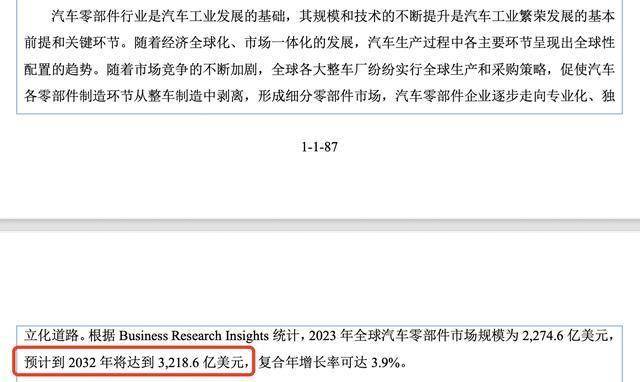 汽车零部件行业是汽车工业发展的基础,其规模和技术的不断提升是汽车工业繁荣发展的基本前提和关键环节。随着经济全球化、市场一体化的发展,汽车生产过程中各主要环节呈现出全球性 配置的趋势。根据Business Research Insights统计,2023年全球汽车零部件市场规模为2,274.6亿美元,预计到2032年将达到3,218.6亿美元,复合年增长率可达3.9%。