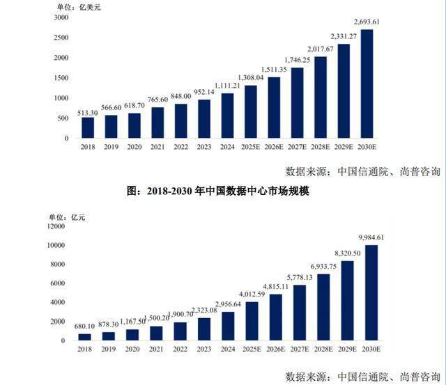 作为各类数据信息和云服务的关键基础设施,数据中心于2020年3月被正式纳入国家“新基建”范畴。伴随5G、云计算、人工智能等新一代信息技术的快速发展,数据资源存储、计算和应用需求大幅提升。作为海量数据和算力的载体,近年来数据中心产业呈现出爆发式增长态势,市场规模持续增长。根据尚普咨询数据显示,全球数据中心市场规模由2018年的513.30亿美元增长至2024年的1,111.21亿美元,CAGR达13.74%,预计2030年将达2,693.61亿美元。根据中国信通院数据及尚普咨询数据显示,我国数据中心市场规模由2018年的680.10亿元增长至2024年的2,956.64.亿元,CAGR达27.75%,预计2030年将达9,984.61亿元。在能效要求日益严苛的背景下,制冷剂泵凭借其高效、可靠、节能等特点,在数据中心精密空调中的应用越来越广泛,逐渐成为数据中心制冷系统的核心动力装置。伴随数据中心的快速发展,制冷剂泵市场规模也将持续扩张。