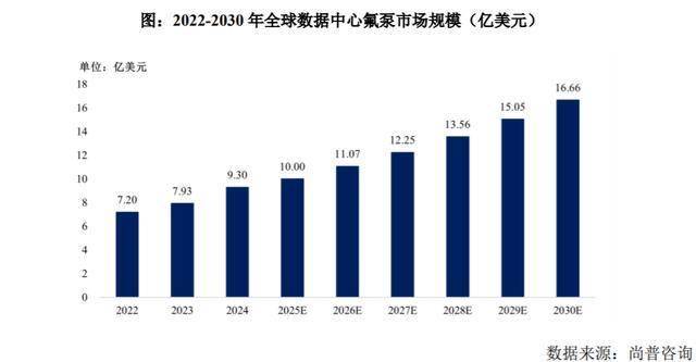 在能效要求日益严苛的背景下,制冷剂泵凭借其高效、可靠、节能等特点,在数据中心精密空调中的应用越来越广泛,逐渐成为数据中心制冷系统的核心制冷部件。伴随数据中心的快速发展,制冷剂泵市场规模也将持续扩张。根据尚普咨询测算,2024年全球数据中心氟泵市场规模为9.30亿美元,预计2030年将达16.66亿美元,2025年-2030年CAGR达10.75%。