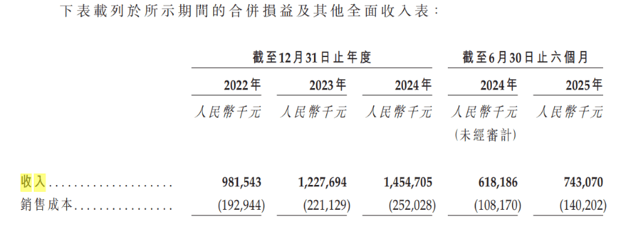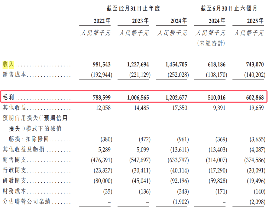 于2022年、2023年、2024年及截至2025年6月30日止六个月,该公司的毛利分别为7.89亿元、10.07亿元、12.03亿元及6.03亿元人民币,同期毛利率为80.3%、82.0%、82.7%及81.1%。