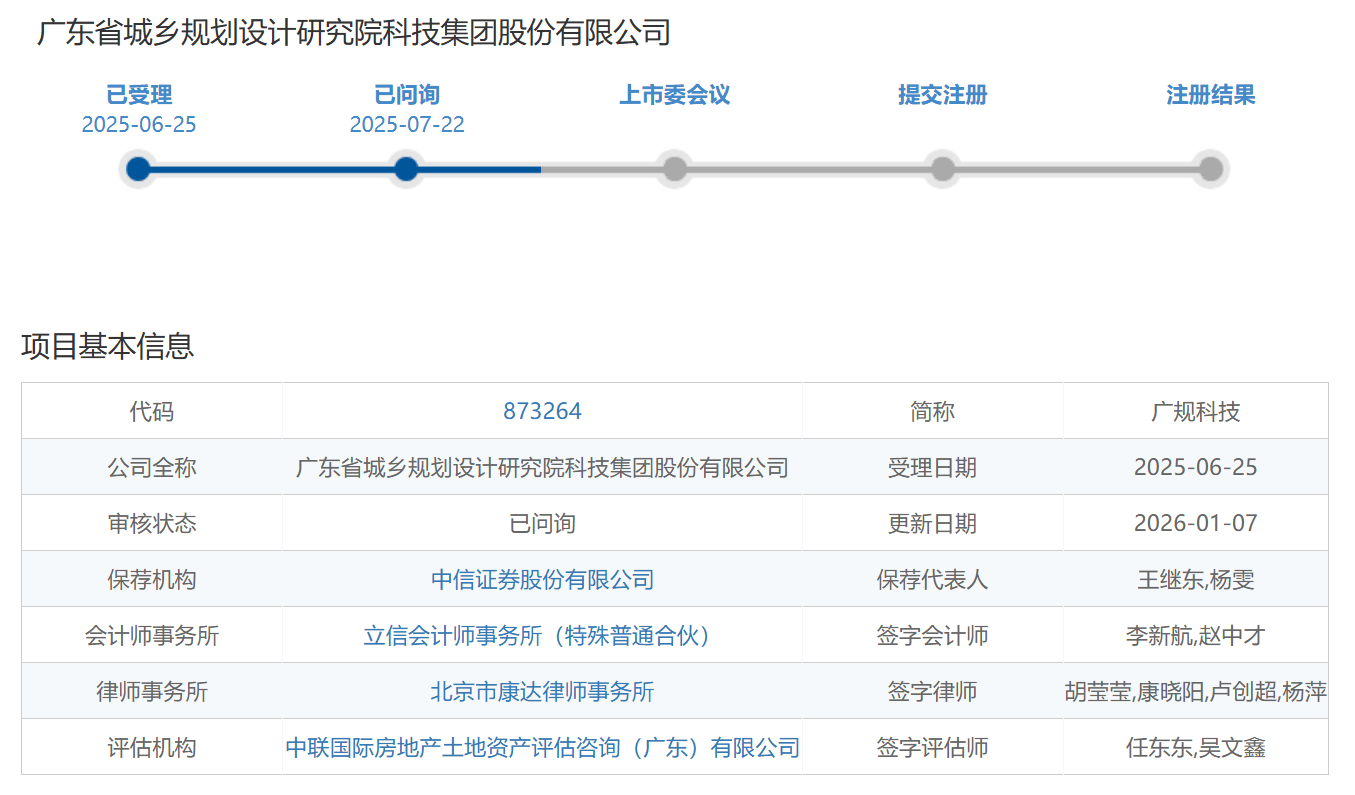 1月7日,广东省城乡规划设计研究院科技集团股份有限公司(简称“广规科技”)在北交所更新上市申请审核动态,公司已回复第一轮审核问询函,回复的问题主要有,关于补充披露发行人的主营业务,关于说明公司的创新性特征,关于规划设计咨询业务业绩增长的合理性及收入真实性等。