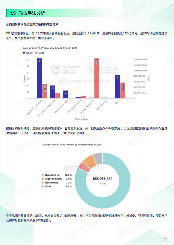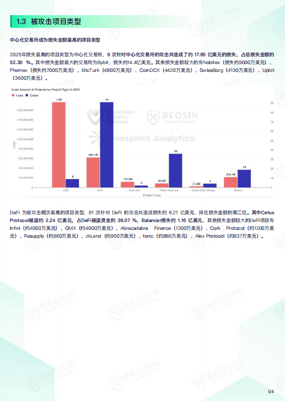 从项目类型分布来看,DeFi依然是受攻击频次最高的领域,全年共发生91次安全事件,损失约6.21亿美元。尽管智能合约漏洞仍是出现次数最多的攻击方式,但行业在私钥保护、权限管理等方面的安全意识有所提升,相关事件数量与损失金额均出现明显下降。此外,攻击目标呈现多元化趋势,从传统的交易所、DeFi协议扩展到支付平台、基础设施、开发工具乃至MEV机器人等更多生态环节,显示出攻击者正在寻找新的薄弱点。