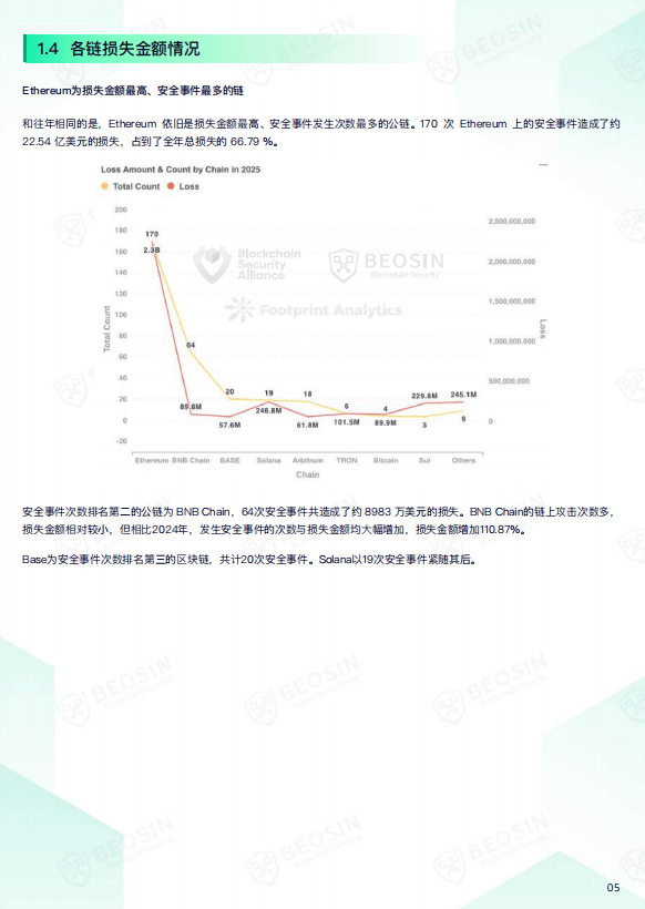 公链安全方面,以太坊仍是损失金额最高、事件数量最多的链,全年发生170次安全事件,损失约22.54亿美元,占总损失近七成。BNB Chain、Base、Solana等链上的安全事件数量也较往年有所增加,尤其BNB Chain在攻击次数上升的同时,损失金额同比增长超过110%,提醒生态参与方需持续加强链上安全管理与监控能力。
