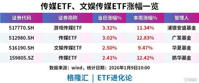 沪指站上4100点关口,AI应用领涨两市,游戏传媒ETF、传媒ETF涨超3%,文娱传媒ETF、传媒ETF涨超2%。
