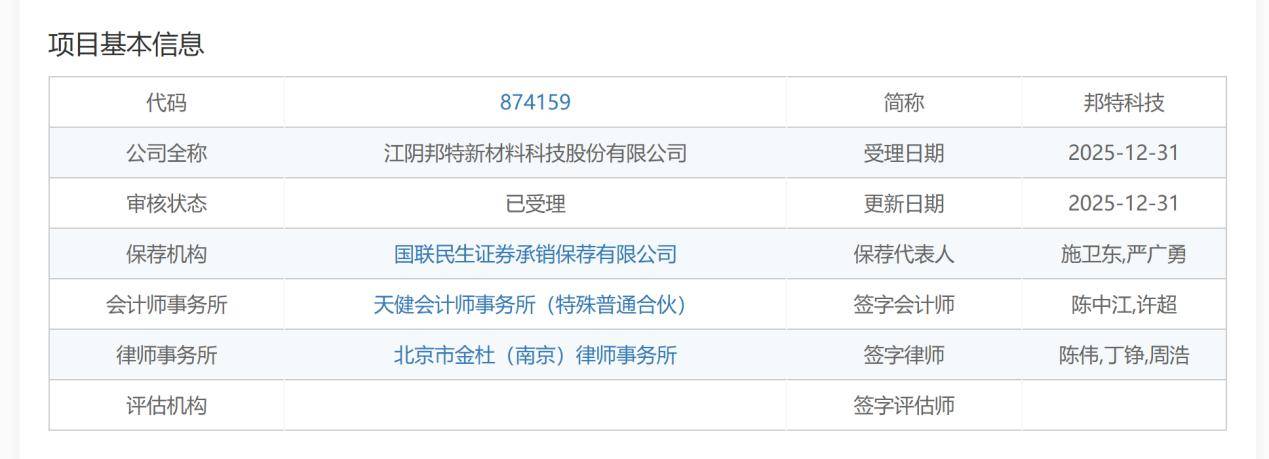 近日,江阴邦特新材料科技股份有限公司(以下简称“邦特科技”)上市申请获北交所受理,保荐机构为国联民生证券。该公司此次IPO拟募资2.82亿元,计划用于功能性胶粘产品扩产项目、研发中心建设项目、补充流动资金。
