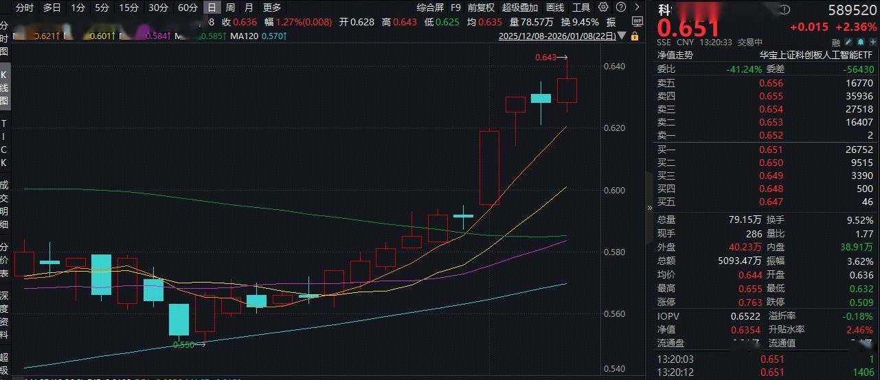 1月9日,国产AI延续强势上涨态势,重点布局国产AI产业链的科创人工智能ETF华宝(589520)场内价格盘中涨近3%,现涨2.36%,实时成交额超5000万元,交投火热!从日k线来看,或已走出坚定的“上行台阶”。