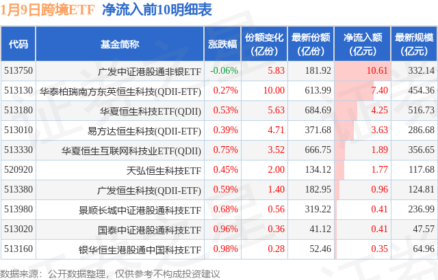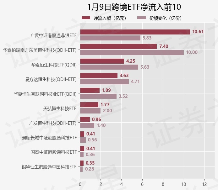当日有35只跨境ETF基金出现资金净流入,其中净流入排首位的是广发中证港股通非银ETF(513750),份额增加了5.83亿份,净流入额为10.61亿元。