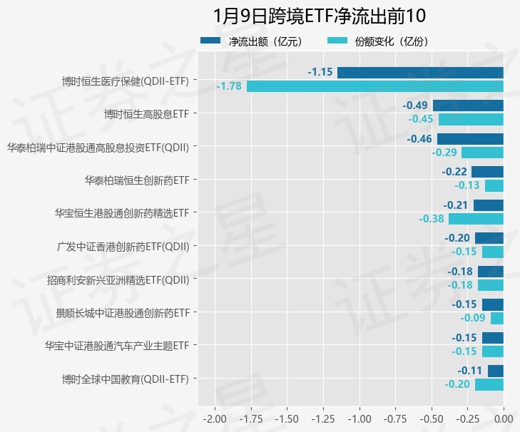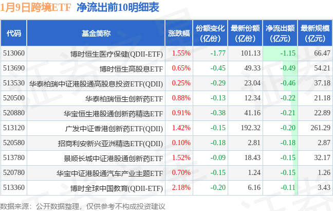 当日有30只跨境ETF基金出现资金净流出,其中净流出排首位的是博时恒生医疗保健(QDII-ETF)(513060),份额减少了1.77亿份,净流出额为1.15亿元。