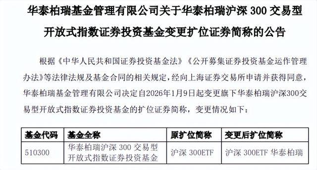 1月9日,A股市场规模最大的ETF基金正式变更扩位证券简称,由“沪深300ETF”更名为“沪深300ETF华泰柏瑞”。在华泰柏瑞基金公告该基金更名的1月7日,富国基金发布公告,宣布对旗下8只ETF产品的场内简称进行集中调整,相关变更自即日起生效。