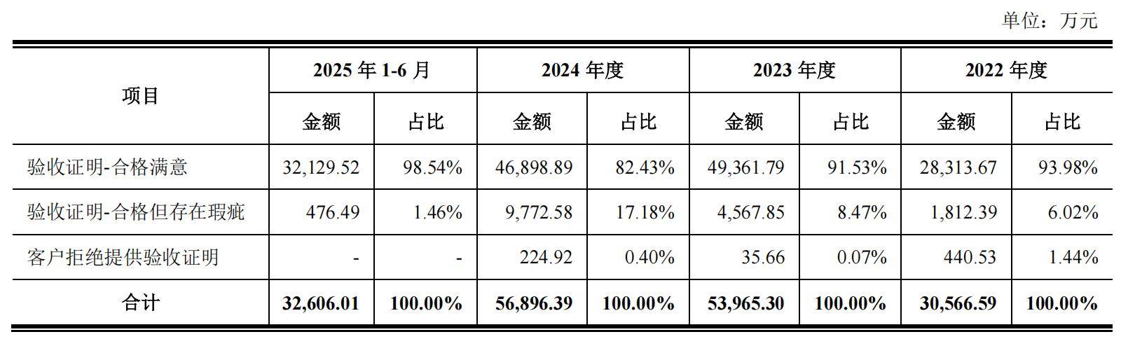 报告期内,客户向公司出具的验收证明附带整改情况(存在内容瑕疵)的项目收入分别为1812.39万元、4567.85万元、9772.58万元及476.49万元,占验收方式确认收入的比例分别为6.02%、8.47%、17.18%及1.46%,主要集中在2023-2024年度。