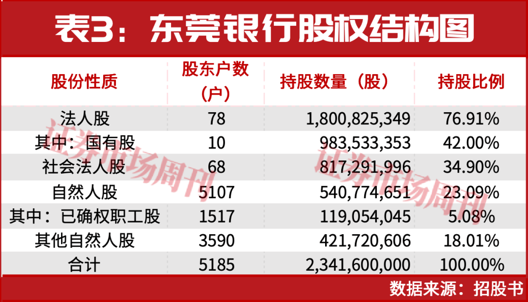 招股书显示,根据广东股权交易中心股份有限公司出具的《关于东莞银行股份有限公司股份托管情况的说明》,截至2025年6月30日,该行总股本为234160万股,股东户数共5185户,其中,法人股东78户,合计持股占该行总股本的76.91%;自然人股东合计持股占总股本的23.09%。其中国有法人持股占比为42%,东莞市财政局是东莞银行的第一大股东,持股21.16%。