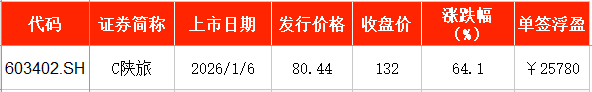 1月6日,陕西旅游在上交所主板挂牌上市,发行价为80.44元/股,截至上市首日收盘,该股报132元/股,涨幅为64.1%。以收盘价计算,投资者中一签浮盈为2.58万元。