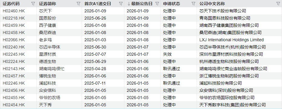 其中,芯天下技术股份有限公司、湖南西子健康集团股份有限公司、桑尼森迪(湖南)集团股份有限公司、浙江博锐生物制药股份有限公司、众安信科(深圳)股份有限公司、爷爷的农场国际控股有限公司、天下秀数字科技(集团)股份有限公司等7家公司为首次递交。