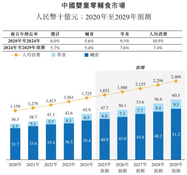 据弗若斯特沙利文数据,中国婴童零辅食的市场规模从2020年的363亿元增至2024年的459亿元,复合年增长率为6.0%,后续预计将以5.7%的速度增长至2029年的605亿元。