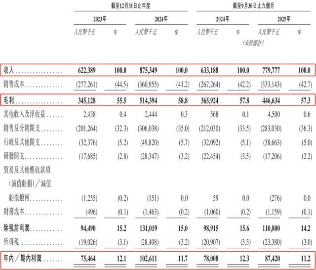 而公司的毛利也在快速上涨,从2023年的3.4亿元增至2024年的5.1亿元,增长率为49.0%,对应的毛利率分别为55.5%及58.8%。2025年前三季度的毛利更是达到4.5亿元,同比增长22.0%,对应的毛利率为57.3%。