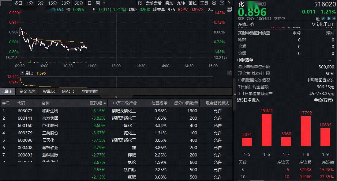 成份股方面,磷化工、氟化工、锂电等板块部分个股跌幅居前。截至发稿,和邦生物大跌超5%,兴发集团、巨化股份、三美股份等多股跌超3%,拖累板块走势。