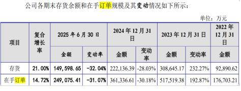 尽管近年来营业收入和净利润持续增长,但公司在手订单却出现下降。报告期各期末,公司在手订单规模分别为17.67亿元、51.75亿元、36.13亿元和24.91亿元,复合增长率为14.72%,与存货增长趋势接近。江松科技在其招股书中解释,受光伏产能加速出清影响,2024年末公司在手订单有所下滑。