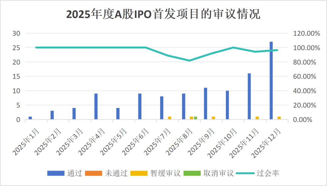 2025年度,A股IPO首发项目共计审核116次,其中通过111家,未通过0家,暂缓审议5家。另有1家取消审核。