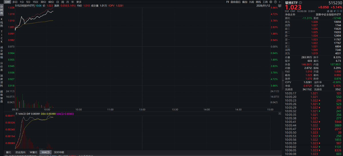 软件ETF(515230)跟踪的是软件指数(H30202),该指数主要选取沪深市场中从事软件开发、销售及相关服务的企业证券作为指数样本,行业配置侧重于信息技术领域,整体风格偏向成长型投资,以反映软件行业相关上市公司证券的整体表现。
