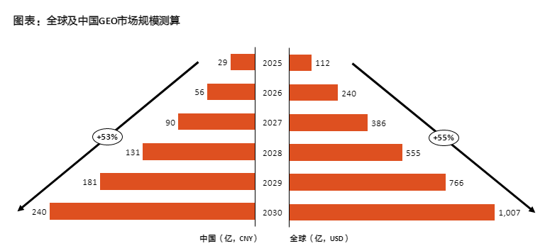 从行业规模及空间看,根据秒针营销科学院测算,预计中国GEO市场规模在2025为29亿人民币,全球为112亿美元,预计到2030年中国达240亿人民币,全球超1,000亿美元。