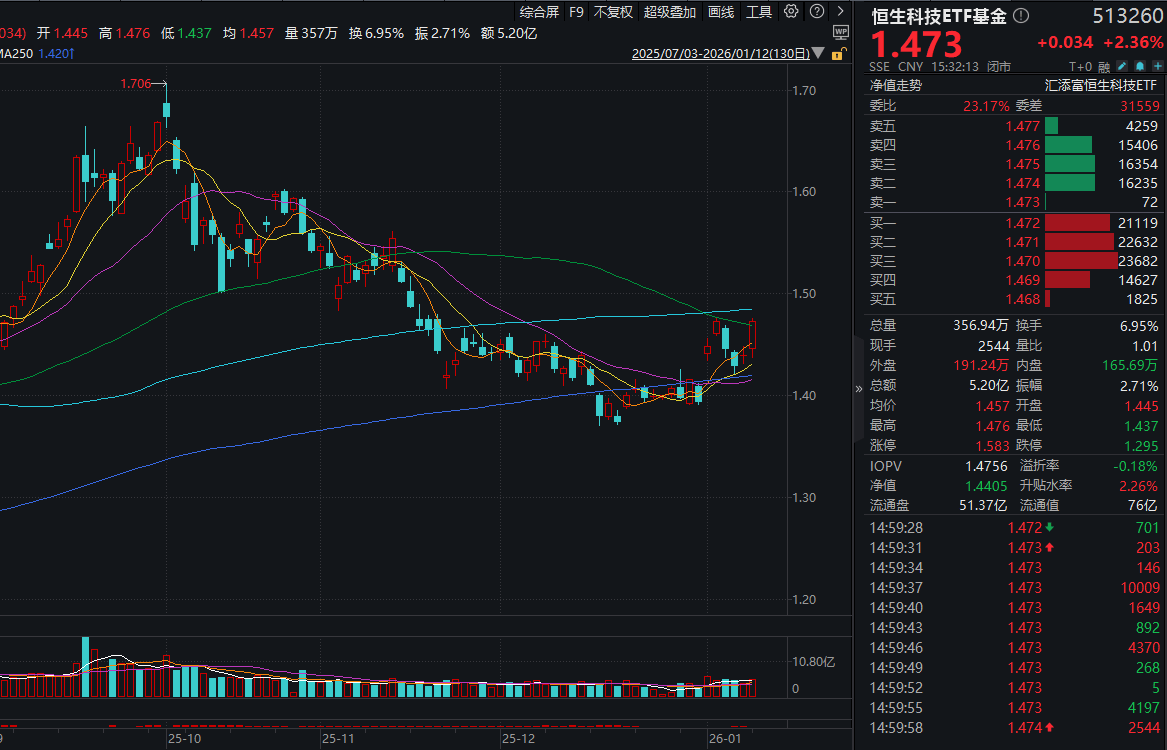 同类唯一15BP最低档管理费的恒生科技ETF基金(513260)亦涨2.36%,全天成交额达5.2亿元。资金面上,近20日有10日获资金青睐,近2日再获资金连续顶格净申购超3100万元,基金最新融资余额再度攀升至超1.4亿元,最新规模达74亿元!