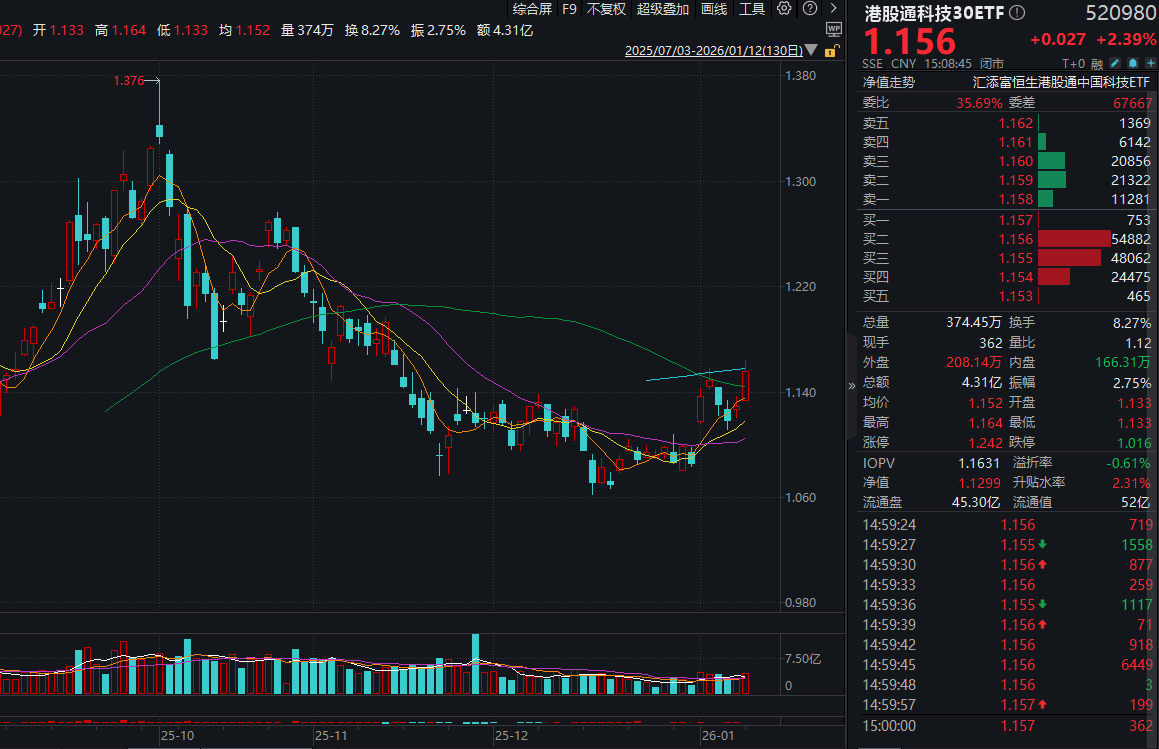 今日(1.12),科技板块飙升,港股科技再度飘红,100%纯度的港股通科技30ETF(520980)收涨2.39%,全天放量成交超4.3亿元!资金面上,近两日再获资金关注,“吸金”超4100万元!