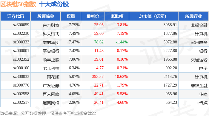 证券之星消息,1月12日,区块链50(399286)指数报收于4548.87点,涨5.34%,成交1384.22亿元,换手率5.35%。当日该指数成份股中,上涨的有49家,科大国创以20.01%的涨幅领涨,下跌的有1家,美的集团以1.44%的跌幅领跌。