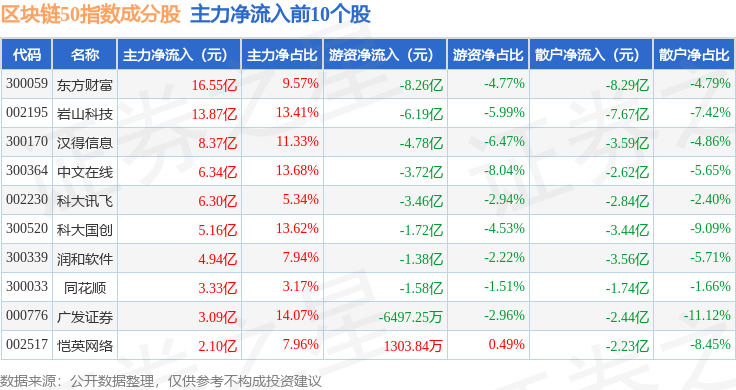 资金流向方面,区块链50(399286)指数成份股当日主力资金净流入合计83.85亿元,游资资金净流出合计45.0亿元,散户资金净流出合计38.86亿元。成份股资金流向详情见下表: