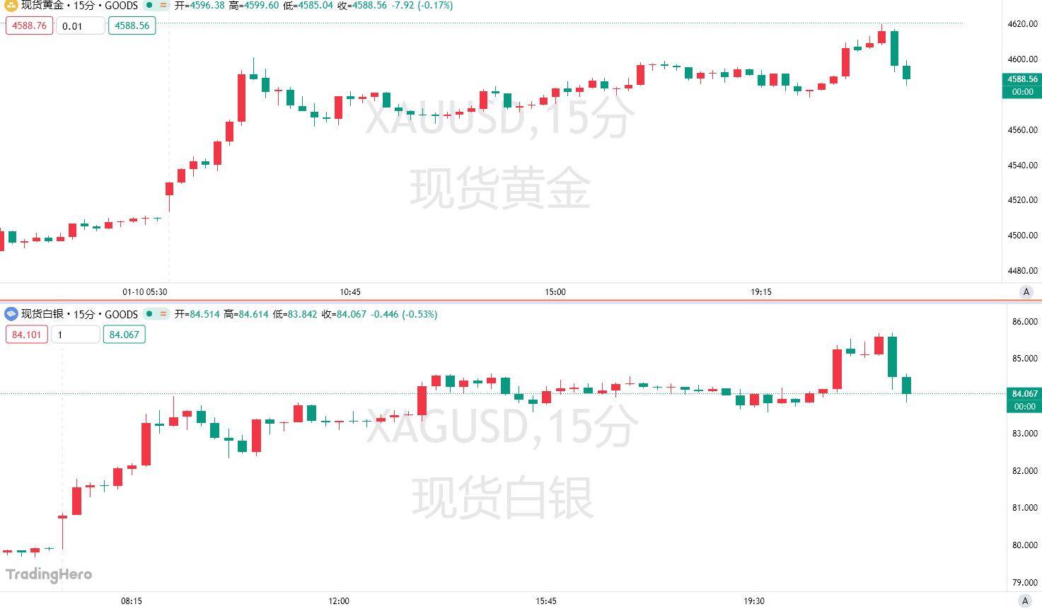 周一美盘,黄金一度涨超2%,并将历史记录刷新至4620美元上方,白银一度暴涨超7%。截止发稿前,二者均有所回落。