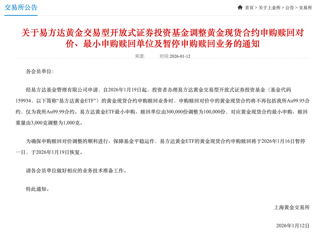 1月12日,上海黄金交易所公告称,经易方达基金管理有限公司申请,自2026年1月19日起,投资者办理易方达黄金交易型开放式证券投资基金(基金代码159934,以下简称“易方达黄金ETF”)的黄金现货合约申购赎回业务时,申购赎回对价中的黄金现货合约将不再包括交易所的Au99.95合约,仅为交易所的Au99.99合约。