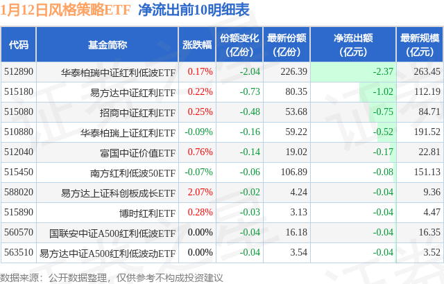 当日有22只风格策略ETF基金出现资金净流出,其中净流出排首位的是华泰柏瑞中证红利低波ETF(512890),份额减少了2.04亿份,净流出额为2.37亿元。