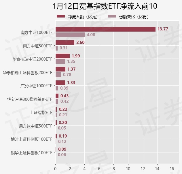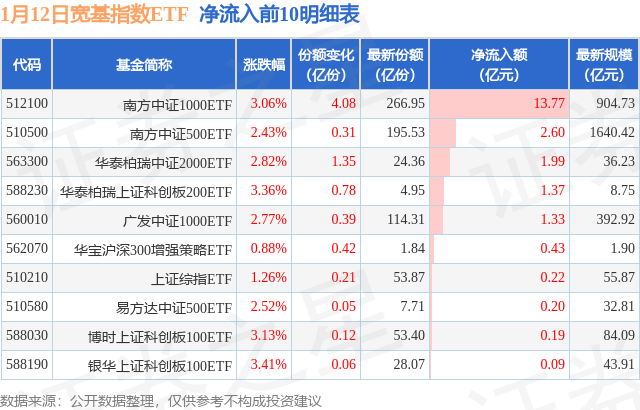 当日有27只宽基指数ETF基金出现资金净流入,其中净流入排首位的是南方中证1000ETF(512100),份额增加了4.08亿份,净流入额为13.77亿元。