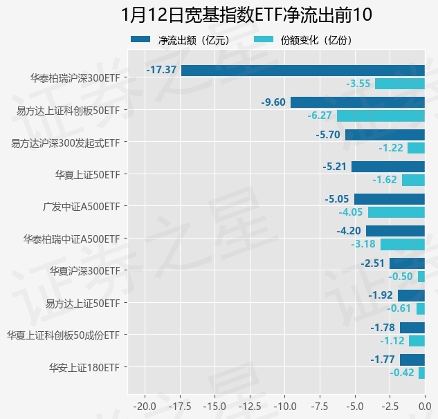 当日有78只宽基指数ETF基金出现资金净流出,其中净流出排首位的是华泰柏瑞沪深300ETF(510300),份额减少了3.55亿份,净流出额为17.37亿元。