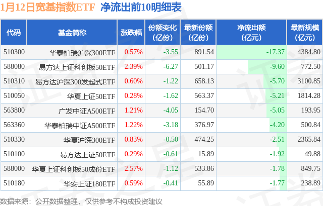 证券之星消息,1月12日宽基指数ETF基金合计资金净流出47.46亿元,近5个交易日累计净流出163.6亿元,5个交易日中出现日合计资金净流出的有3天(ETF资金流向计算公式:(当日ETF场内流通份额-前一交易日ETF场内流通份额)*当日ETF均价,计算结果仅供参考)。