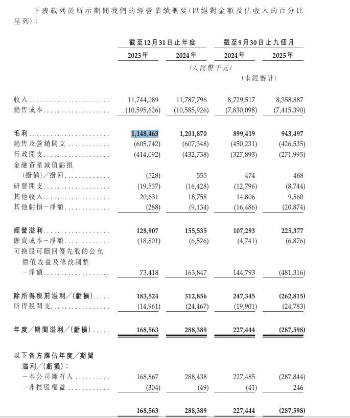 财务方面,钱大妈2023年、2024年两年营收分别为约117.44亿元、117.88亿元;毛利分别约11.49亿、12.01亿元;经营利润分别约为1.29亿元、1.55亿元。2025年前9个月,钱大妈营收约83.59亿元,上年同期约87.29亿元;毛利约9.43亿元,上年同期的毛利约8.99亿元;钱大妈2025年前9个月经营利润约为2.25亿元,而上年同期的经营利润约1.07亿元。