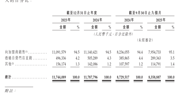 值得注意的是,从渠道划分来看,向加盟商销售金额成钱大妈主要收入来源,占其总收入比例较高。招股书显示,2023年至2025年9月30日,钱大妈向加盟商销售金额分别约为110.91亿元、111.40亿元、79.54亿元,对应占总收入比例分别为94.5%、94.5%、95.1%。