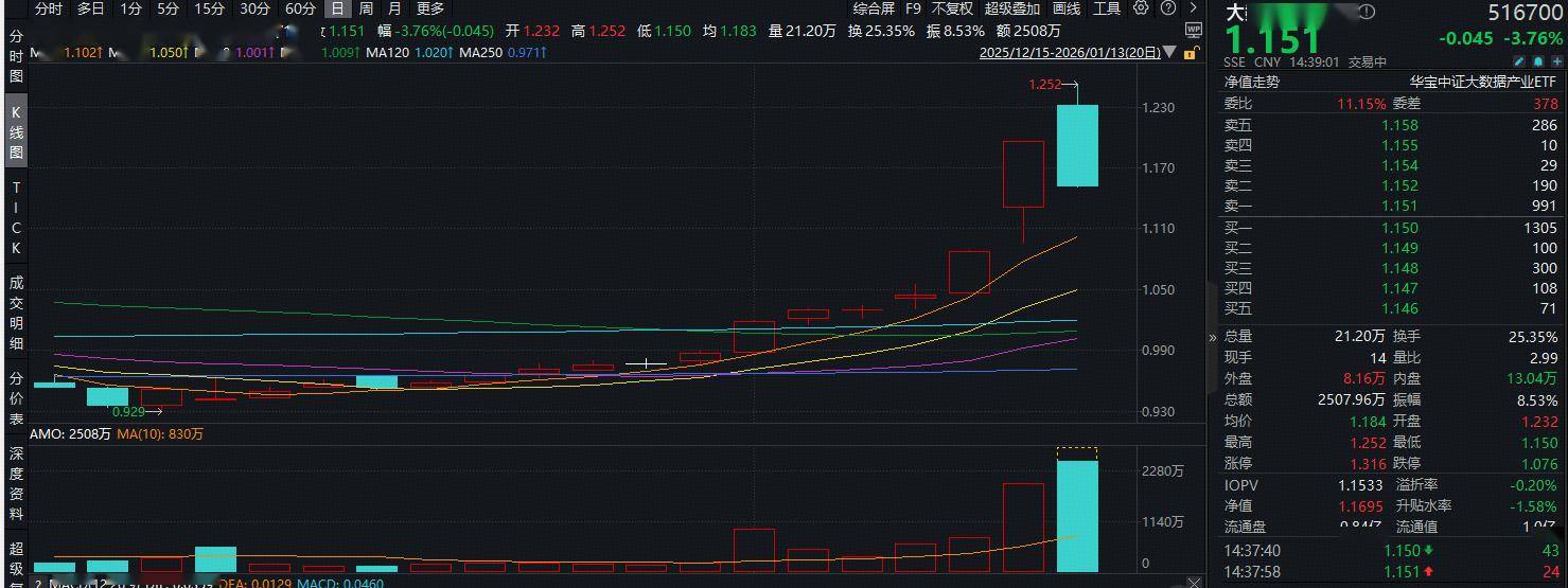 重点布局算力、AI应用领域的大数据ETF华宝(516700)昨日涨停,斩获日线12连阳后,今日(1月13日)开盘,场内价格一度涨超3.7%再创上市新高,后随市盘整回调,现跌3.76%,截至当前,振幅达8.53%。