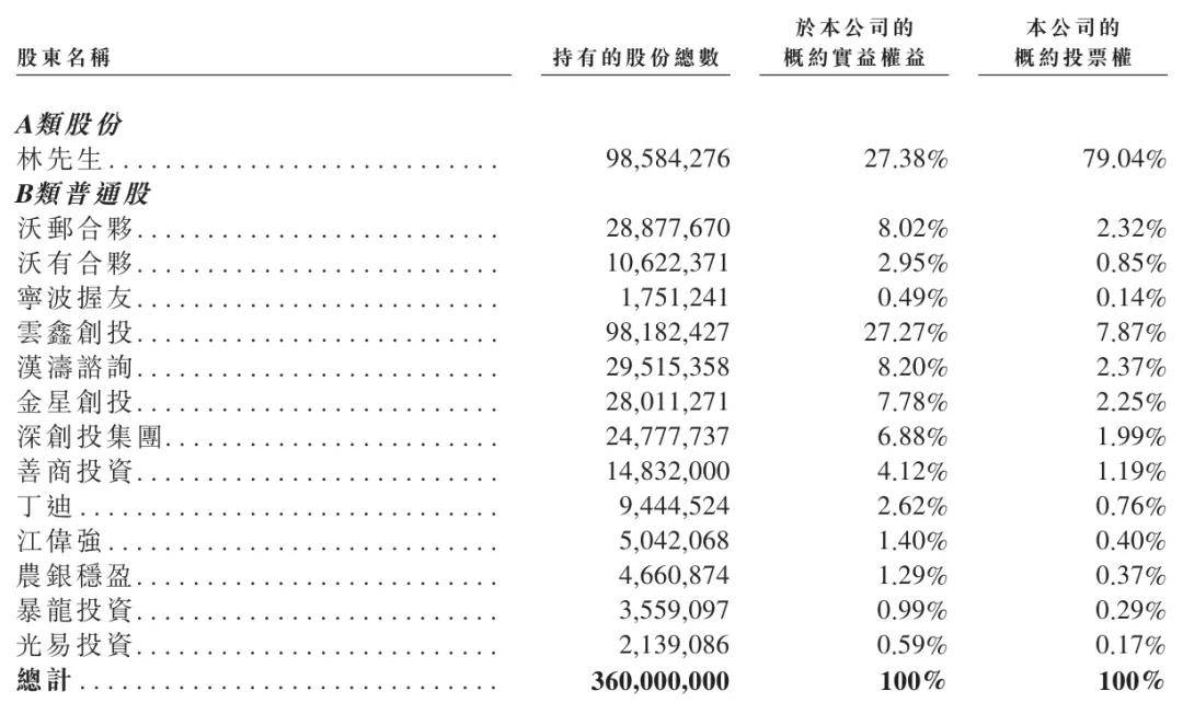 林喆一共控制38.83%股权,控制82.35%的投票权。