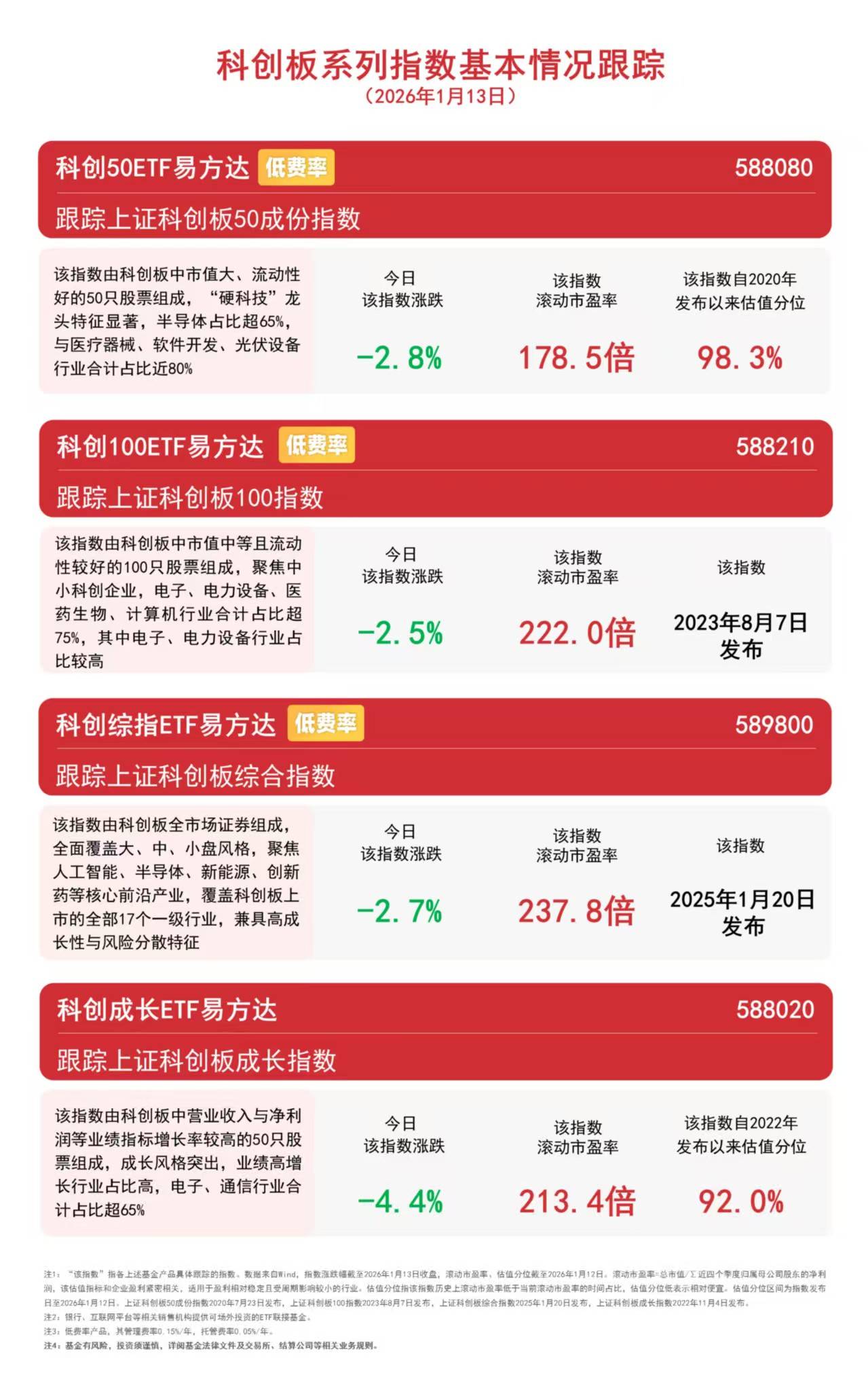 1月13日,A股市场迎来调整,商业航天概念股集体退潮,AI应用、创新药械板块表现活跃。截至收盘,科创100指数下跌2.5%,科创综指下跌2.7%,科创50指数下跌2.8%,科创成长指数下跌4.4%。