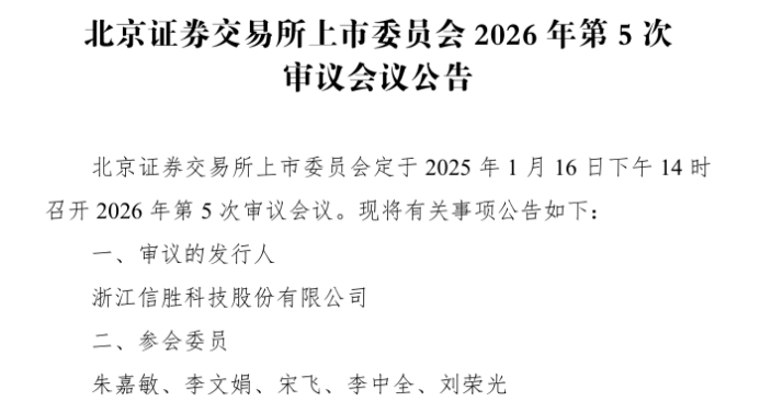 根据北交所安排,浙江信胜科技股份有限公司(以下简称“信胜科技”)将于1月16日上会,接受北交所上市委当日召开的2026年第5次审议会议的首发审核事宜。