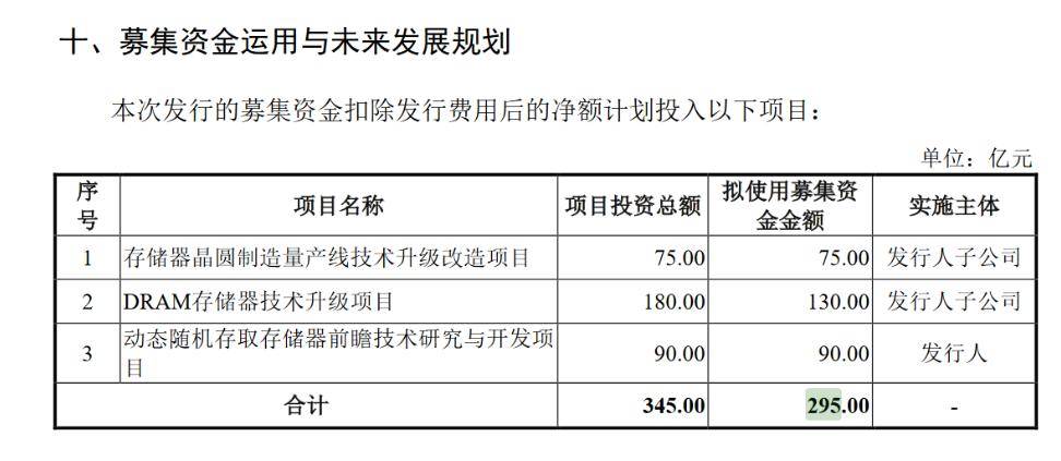 295亿元的募资项目中,75亿元拟用于产线技术的升级,180亿元用于DRAM技术的升级,90亿元用于前瞻技术的开发。