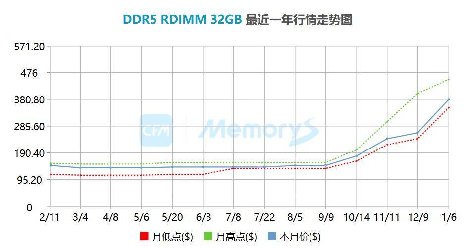2025年下半年以来,DDR价格加速上涨,CFM闪存官网数据显示,以DDR5 32GB产品为例,2025年7月价格仅为135美元,到2026年1月最高涨至450美元,当前价格虽回落至380美元,但较去年7月低点涨幅仍超230%。