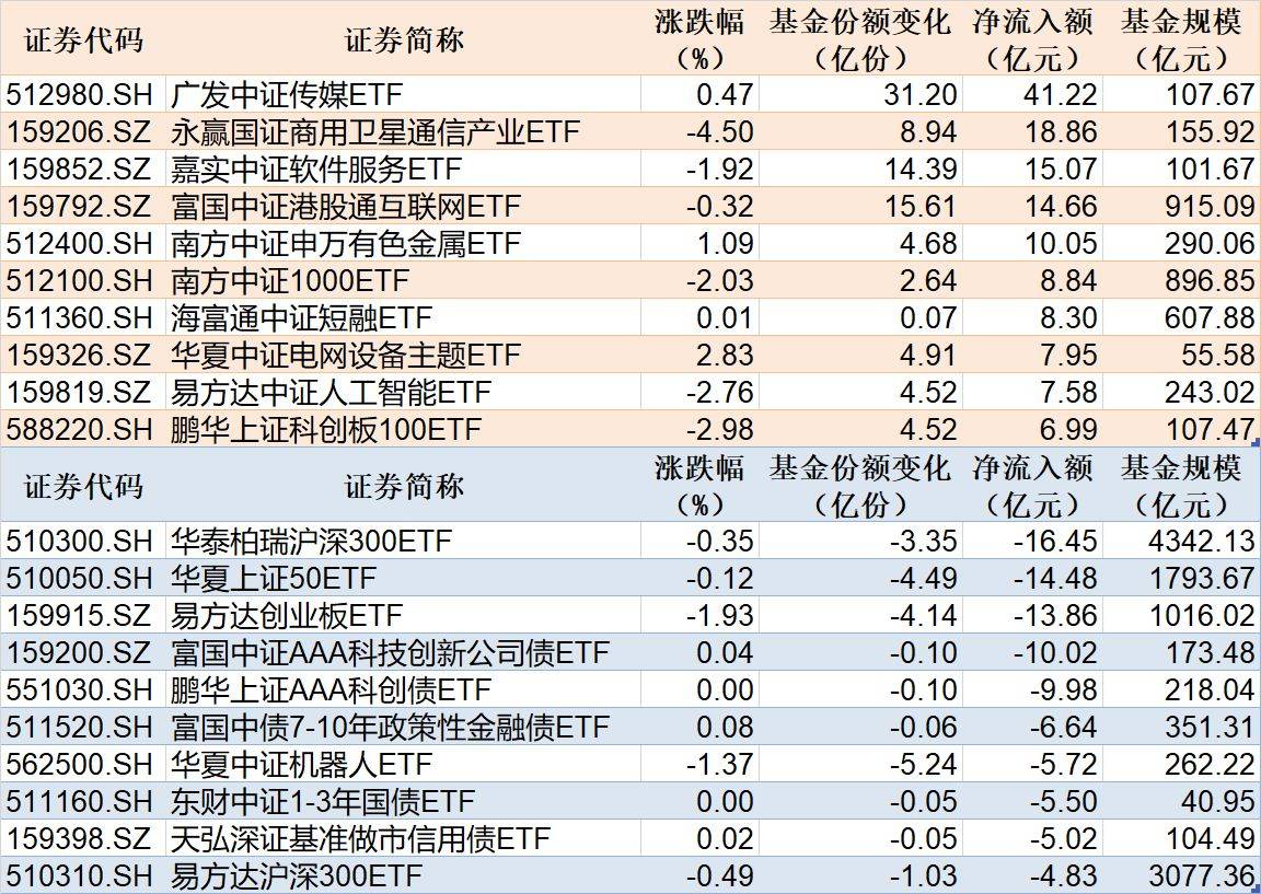 与此同时,华泰柏瑞沪深300ETF基金份额减少3.35亿份,净流出额16.45亿元;华夏上证50ETF基金份额减少4.49亿份,净流出额14.48亿元;易方达创业板ETF基金份额减少4.14亿份,净流出额13.86亿元。