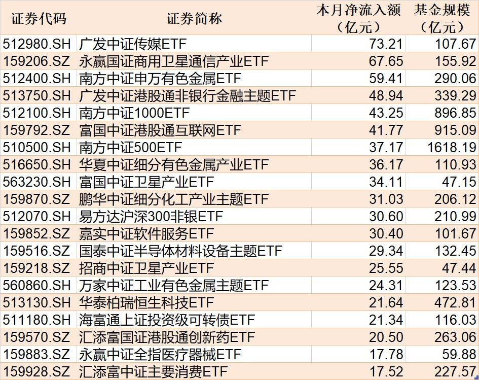 截至1月13日,本月资金净流入额居前20的ETF名单如下: