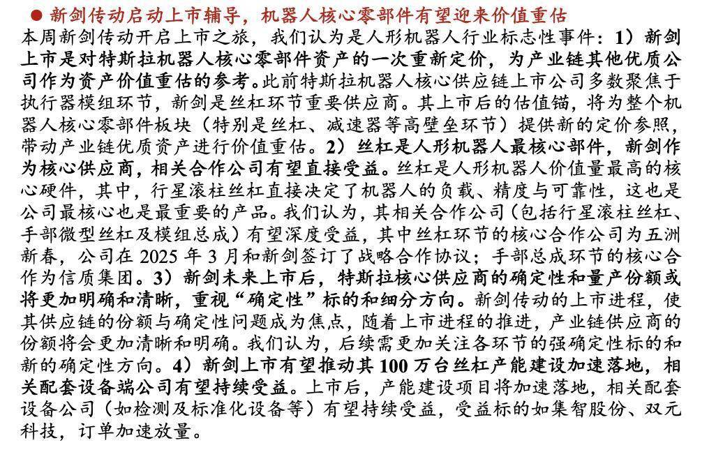 开源证券近日发布研报指出,新剑传动启动上市辅导是人形机器人行业标志性事件,是对特斯拉机器人核心零部件资产的一次重新定价,为产业链其他优质公司作为资产价值重估的参考。此前特斯拉机器人核心供应链上市公司多数聚焦于执行器模组环节,新剑是丝杠环节重要供应商。其上市后的估值锚,将为整个机器人核心零部件板块,带动产业链优质资产进行价值重估。