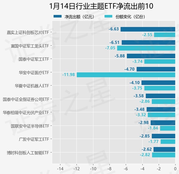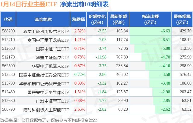 当日有159只行业主题ETF基金出现资金净流出,其中净流出排首位的是嘉实上证科创板芯片ETF(588200),份额减少了2.55亿份,净流出额为6.63亿元。