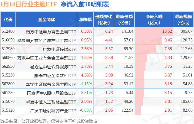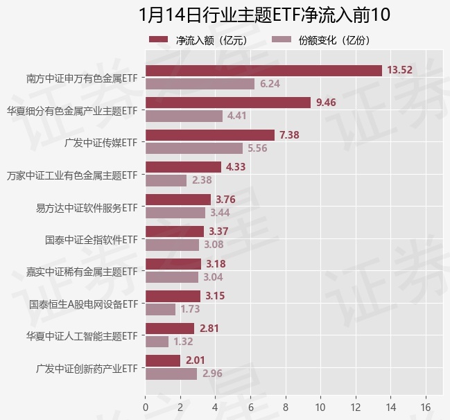当日有109只行业主题ETF基金出现资金净流入,其中净流入排首位的是南方中证申万有色金属ETF(512400),份额增加了6.24亿份,净流入额为13.52亿元。