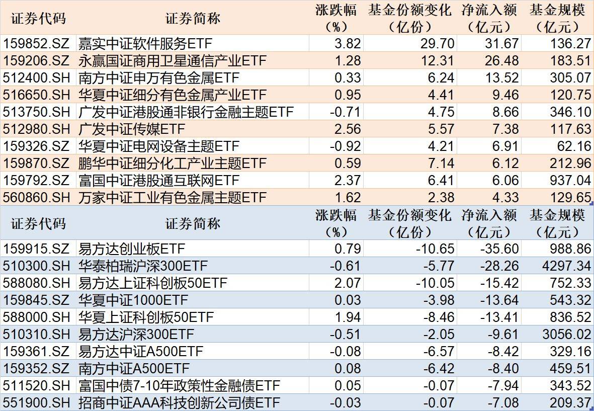 Wind数据显示,在1月14日的非货币ETF市场中,嘉实中证软件服务ETF基金份额增加29.70亿份,净流入额31.67亿元;永赢国证商用卫星通信产业ETF基金份额增加12.31亿份,净流入额26.48亿元;南方中证申万有色金属ETF基金份额增加6.24亿份,净流入额13.52亿元。